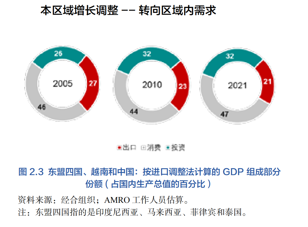 令人鼓舞的是,東盟+3地區在此期間大多數經濟體的國內需求表現強勁,緩解了全球貿易疲軟對經濟的影響。各國當局實施了有針對性的一攬子財政計劃和寬松的貨幣政策,促進了各國國內消費和國內投資,尤其是基礎設施和房地產投資。此外,中國在4萬億人民幣財政刺激政策下實現了快速增長,對整個東盟+3地區產生了巨大的積極溢出效應,緩解了美國和歐元區外部需求疲軟的影響。中國的經濟刺激計劃主要集中在基礎設施建設方面,這為東盟經濟體(即柬埔寨、印度尼西亞、老撾人民民主共和國、馬來西亞和越南)參與跨境項目提供了機會,從而促進了區域內的投資。在主要發達經濟體增長乏力時,東盟+3地區實現了根本增長動力的重新調整,從依賴外需轉為區域內部需求,支撐了本區域過去10年的強勁增長(AMRO 2019;AMRO 2020)。圖2.3顯示,來自東盟四國(印度尼西亞、馬來西亞、菲律賓、泰國)、越南和中國的內需(扣除進口)在出口總增值中所占的份額從2005年的72%上升到2021年的80%左右。在過去10年,區域內需占主導地位,區域內制成品中用于區域外出口的份額減少,而用于滿足中國和該區域其他國家最終需求的增值出口份額增加(進一步討論見第三節)。