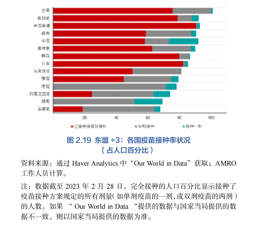 2022年以來,該地區終于在疫情防控中取得決定性勝利,可以預期更全面的開放和更強勁的經濟復蘇。特別是東盟地區(圖2.18),得益于其國內需求的強勁反彈,東盟地區在2022年呈現出比+3地區經濟體更強勁的增長。新冠病毒抑制措施的取消釋放了被壓抑多年的需求,消費支出和投資總額激增。更重要的是,盡管2023年初出現了大規模的奧密克戎感染事件,但較高的新冠病毒疫苗接種率(包括初次接種和加強針接種)使東盟經濟體重新保持開放的趨勢(圖2.19),對國際游客重新開放邊境大幅促進了那些依賴旅游業的經濟體的增長。