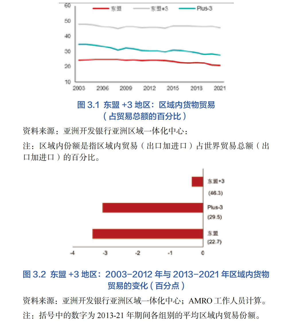在亞洲的各個次級區域中,東盟+3地區是迄今為止貨物貿易一體化程度最高的區域——這反映了東盟+3在全球價值鏈中的關鍵作用及其完善的生產網絡4。作為區域和全球重要制造業中心中國在近年來不斷崛起,構成了東盟+3地區跨境生產網絡的強大推動力。這一趨勢在中間品,特別是來自東盟的中間品上表現的更為明顯。2013年至2021年期間,東盟+3地區的平均區域內貿易份額接近46%(圖3.1)5,與前10年相比較穩定。然而,該份額在2017年達到47%的峰值后,近年來有所下降,反映出各種外部沖擊對全球經濟增長和貿易的影響,尤其是中美貿易緊張局勢、新冠疫情以及隨后的俄烏沖突。