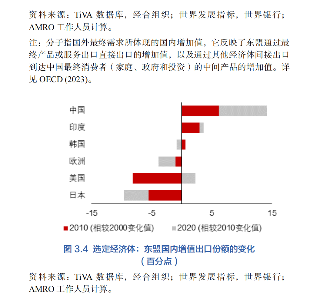 這一下降也反映在該地區的次區域貿易中,如:東盟和+3地區各自的區域內貿易份額在過去10年中也有所下降(圖3.2),然而,“東盟+3”整體的區域內貿易份額并沒有大幅下降,而且仍然高于各次地區的份額。這表明東盟經濟體正在與其+3鄰國進行更多的一體化和貿易,反之亦然。東盟與中國中間產品緊密的貿易聯系是這一趨勢的基礎。事實上,自2008-2009年全球金融危機以來,中國一直保持著東盟最大貿易伙伴的地位(新華社,2022)。此外,雙邊貿易的性質也發生了變化。中國與東盟經濟體的貿易傳統上以中間產品為主,中國再向美國等其他市場出口最終產品。然而,從增值額份額的角度深入研究中國東盟貿易的性質,可以發現東盟與中國的貿易正由中間品貿易轉為滿足中國需求的最終品(圖3.3),促進了該地區的增長動力的調整(見第二節的討論)。例如,2021年,中國吸收了東盟區域各國的國內價值增值總額中出口部分的20%,而這一比例在2000年僅為6%(圖3.4)。不過,各國的情況也不盡相同:在東盟10個經濟體中,中國已經取代美國成為了其中7個經濟體的國內價值增值總額中出口部分的最大消費國(主要是在全球金融危機之后)。6這表明經濟增長——尤其是該區域內高度開放和依賴貿易的經濟體的增長——與中國的需求有著千絲萬縷的聯系,而且今后這一現象將愈發顯著。