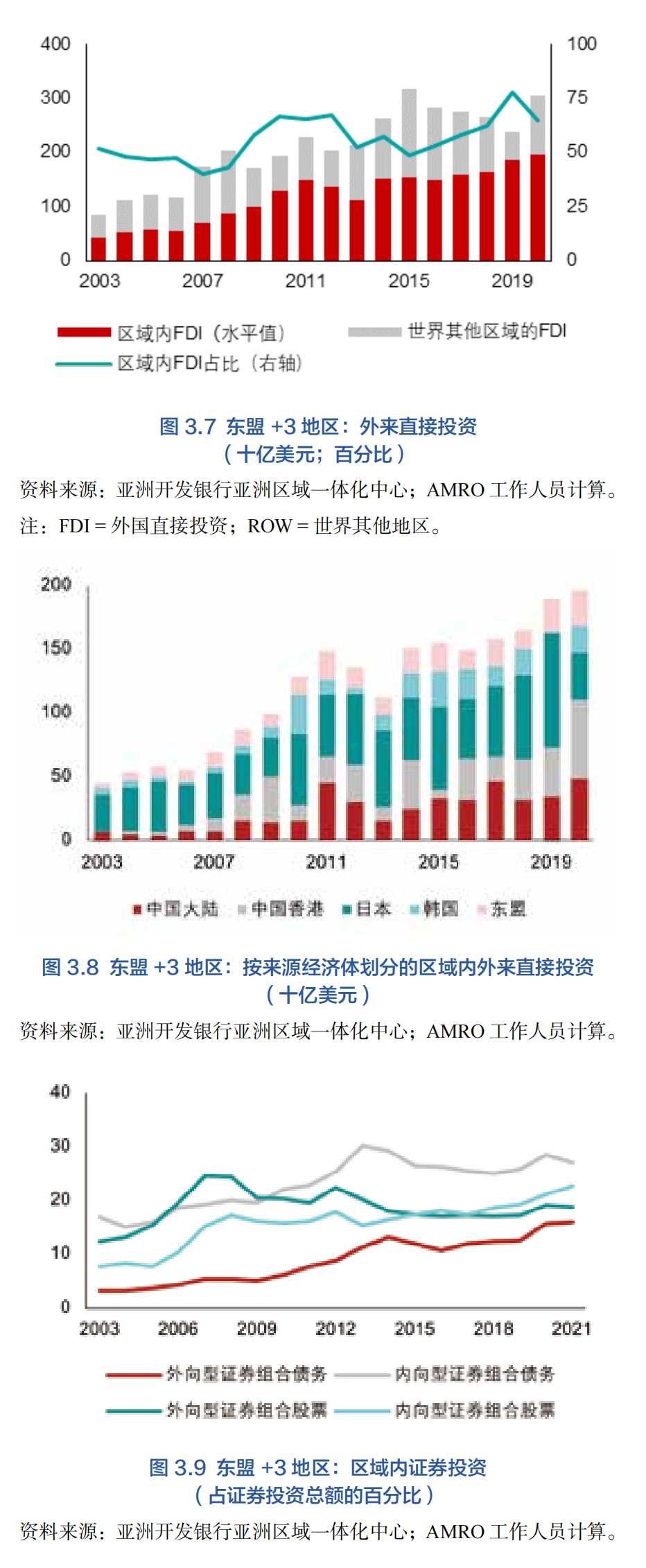 因此,東盟+3地區中約60%的外商直接投資來自本區域內部,其中大部分來自中國、日本和韓國。以往,區域內流入東盟的外國直接投資主要來自日本跨國企業,但近年來來自中國(包括香港)的投資份額也顯著增加;另一方面,東盟內部的外國直接投資基本穩定在17%左右(圖3.8)。大部分外國直接投資流入制造業,尤其是電氣和光學設備、金屬、化工和運輸設備行業——也是區域價值鏈最為強大的幾個行業。在2018-2019年中美貿易緊張局勢期間,區域內投資仍保持韌性,但在2020年,隨著新冠病毒大流行,區域內投資有所下滑,尤其是受日本對東盟對外投資下降的影響。盡管如此,該地區在疫情后呈現強勁復蘇趨勢,使得該區域外國直接投資額在2023年得到恢復,尤其是與清潔和可再生能源、數字化以及“三新”經濟相關的行業(AMRO 2020、AMRO 2023a)。