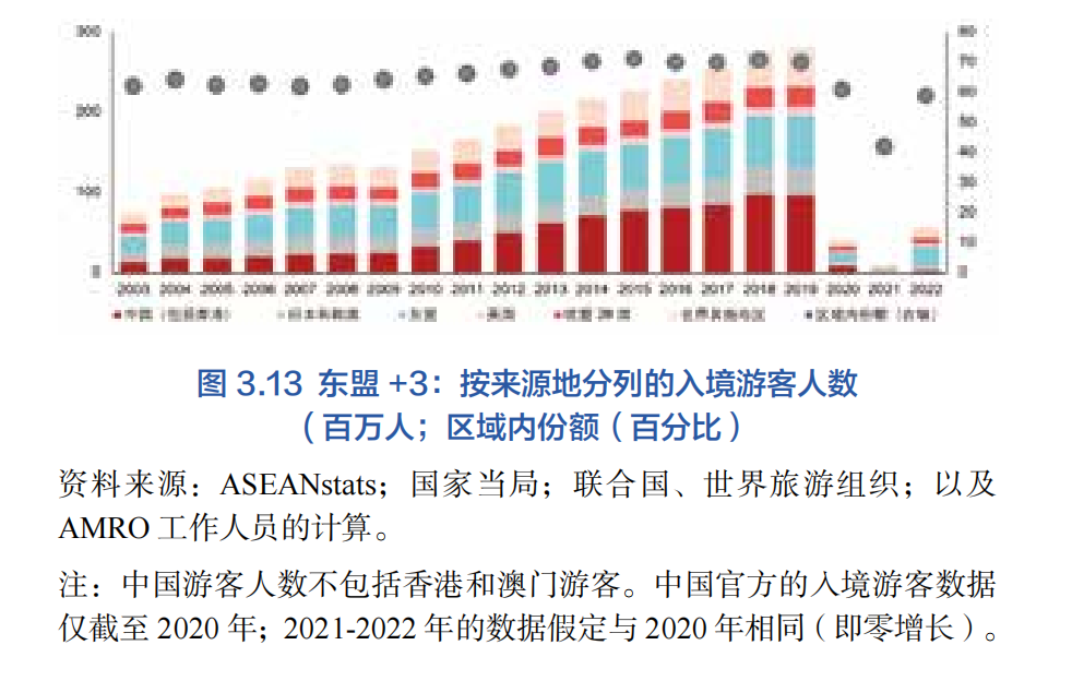 超過70%的游客來自本地區,因此區域內旅游是東盟+3一體化的一個主要特征。