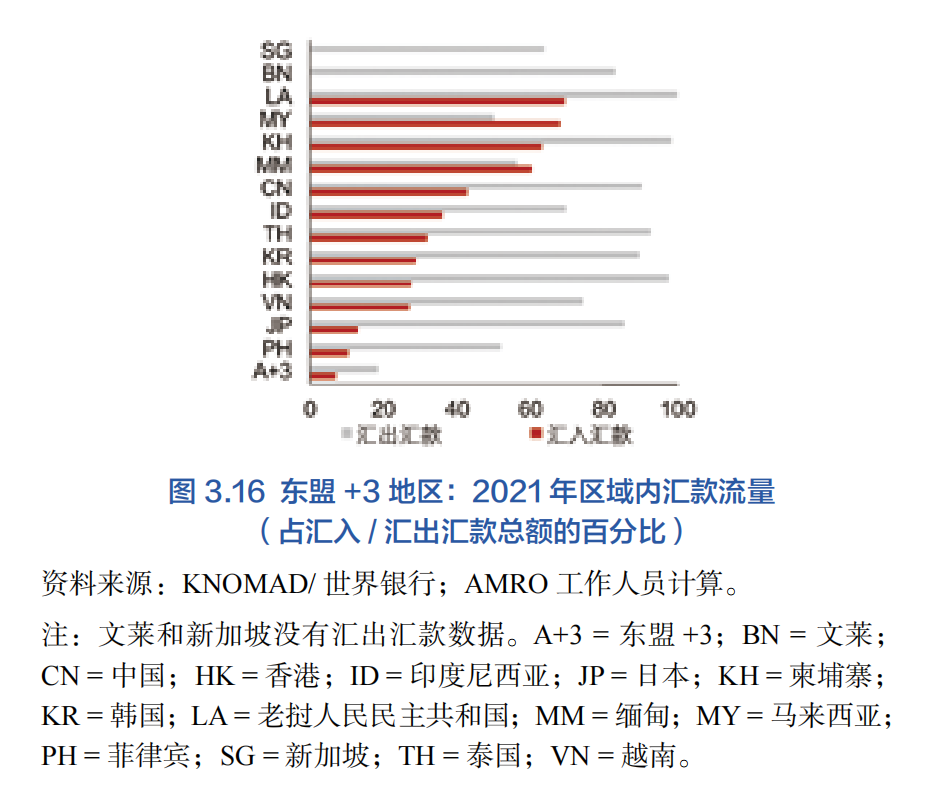 另一方面,近期出境移民的趨勢表明,東盟+3經濟體中的許多人仍傾向于前往區域外的經濟體(圖3.15)。發達經濟體的高收入機會是東盟+3移民,尤其是技術工人移民的主要推動因素。2020年,超過60%的出境移民前往北美和中東等市場。超過60%的老撾、柬埔寨、馬來西亞和緬甸的出境移民移居到周邊經濟體;相比之下,來自菲律賓、日本和文萊的移民主要移居到東盟+3地區以外的經濟體。這也反映在雙邊匯款流量上:2021年,前一組經濟體從東盟+3收到的匯款至少占其匯款總額的三分之二(圖3.16)。然而,總體而言,東盟+3匯入匯款總額中只有7%來自區域內。這可能是多種因素共同作用的結果:(1)離開東盟+3地區的出境移民人數較多;(2)東盟+3移民的人均匯款額較低,以及(3)新冠疫情的影響。大約20%的匯出匯款留在本區域(由區域內匯出匯款流量占其向外匯款總額衡量)。但是,在2010年至2021年期間,該地區14個經濟體中有9個經濟體的東盟+3地區內移民占其出境移民的比例不斷上升,這將支持未來幾年的地區內匯款比例上升。